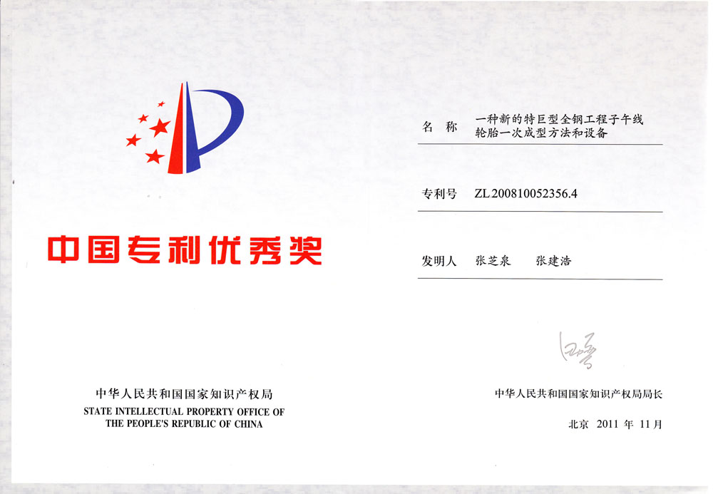 中國專利優(yōu)秀獎(jiǎng)——一種特巨型全鋼工程子午線輪胎一次成型方法和設(shè)備